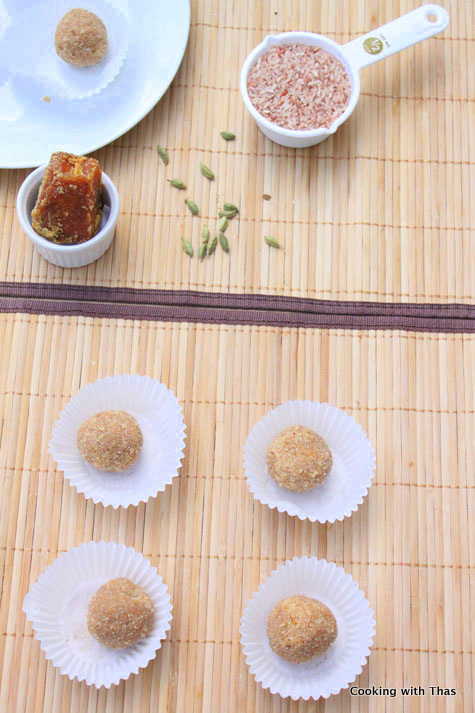 Ariyunda is a snack that has been favorited by almost all Keralities. Ariyunda is the malayalam word for Rice balls (Ari=Rice and Unda=ball). It’s such a simple and easy snack which can be prepared in just a matter of minutes using the ingredients that are always seen in the pantry. In fact the recipe calls only for 3 main ingredients: ground red rice, grated jaggery and grated coconut. One specialty about this rice balls is that you need to use Red rice or Rosematta rice, to me red rice is the most delicious among rice. Red rice imparts an earthy and rustic flavor to this snack.