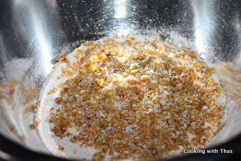 - In a blender, pulse the grated jaggery, grated coconut and cardamom, this is just to combine them together.