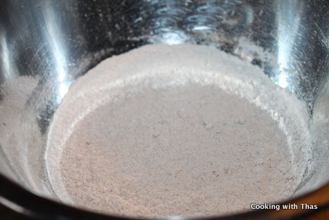 - In a large bowl, using your hands combine the ground rice, jaggery, coconut and cardamom together. Crush any jaggery lumps in the mixture using your hands.