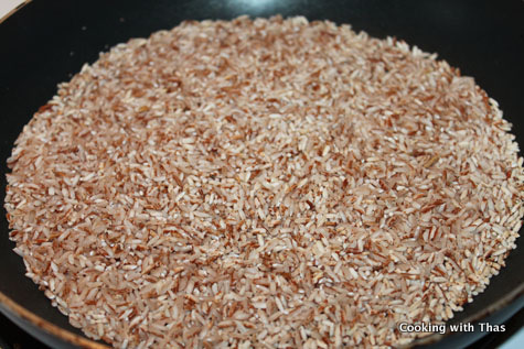 - In a skillet, roast the red rice over medium heat till it starts to give out the roasted smell about 5-7 minutes. Don't over roast or burn the rice.
