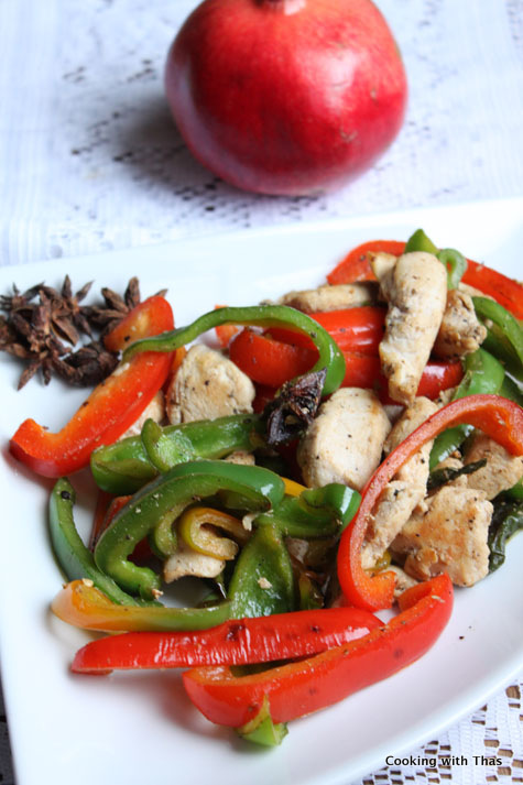 I believe in simple cooking and using ingredients that are always found in my pantry and refrigerator. Many times, dishes that are made with simple natural ingredients tastes better than those made with complicated ingredients and methods. This is one such chicken stir fry, I just added a few spices to make it aromatic and flavorful; I didn’t add any sauce. So let’s forget about all those store bought sauces and make it with natural spices. This is a dry dish, it can be either wrapped in a pita bread or tortilla or even rotis or serve along with salad.