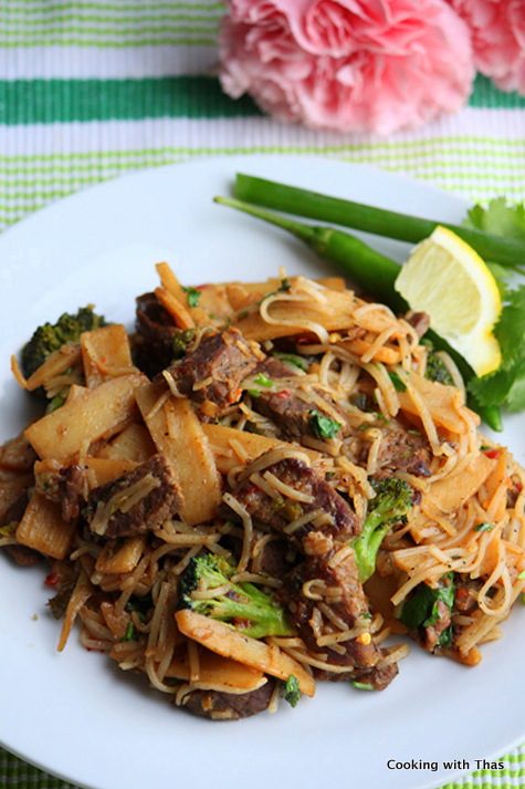 I’m a huge fan of stir fries and I do have a soft corner towards beef and noodle stir fries. Whenever I buy beef strips I will be seen making this dish. I perk up the flavor of this dish with Asian sauces and seasonings. Beef strips, veggies and rice noodles when stir fried together makes a delicious one pot meal.