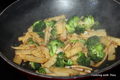 - Add broccoli florets and bamboo shoots, stir fry for a few minutes.