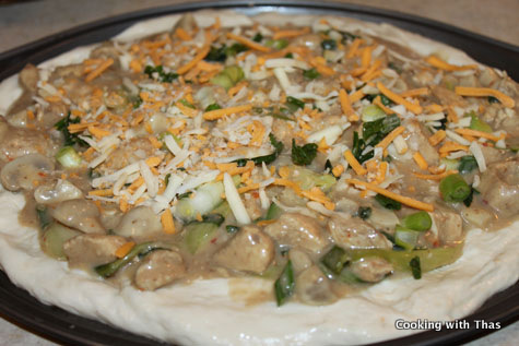 - Spread the prepared chicken along with the sauce over the rolled dough evenly, generously sprinkle cheese and scallions over it.