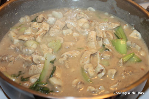 - Add mushrooms and bok choy to the chicken and cook till mushrooms turn tender.