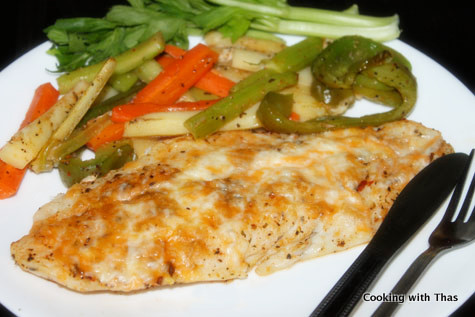 - Take the Tilapia out of the oven and spread cheddar cheese over each fillet.
