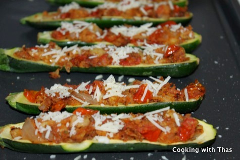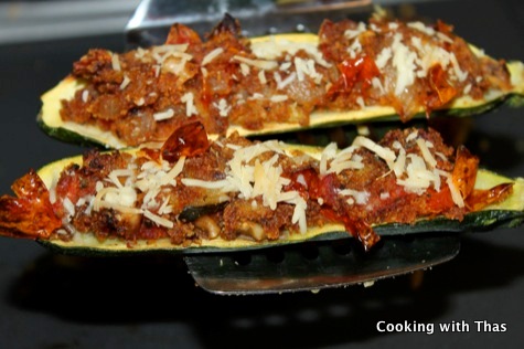 - Flip over the zucchini shells and stuff with this filling.