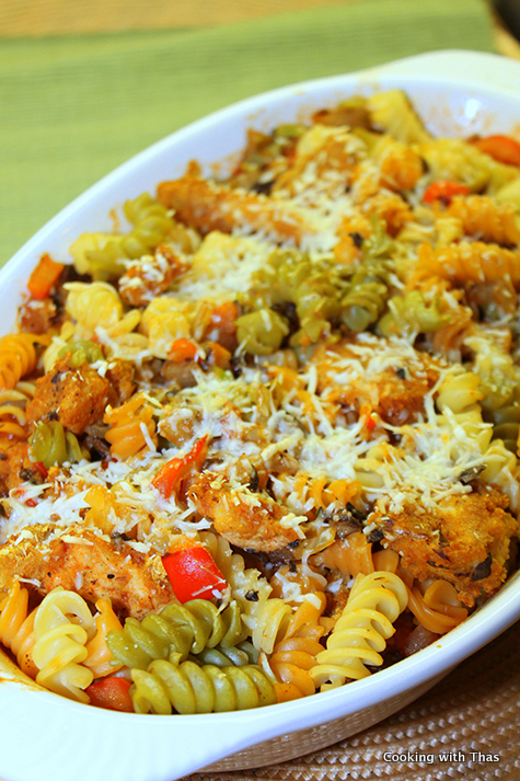 - Top with baked crusted chicken and pasta. Slightly combine the chicken and pasta into the sauce.