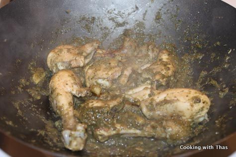 In the original recipe, marinated chicken is fried in the oil. Well, I made a healthy twist to the recipe and baked the chicken instead. The baked chicken was then stir fried in little oil so that it would get a fried taste. Combined with the green sauce till the chicken turned browned and the sauce got stuck to the chicken. The browned chicken along with the sauce tastes remarkable that you will become a slave for this dish.