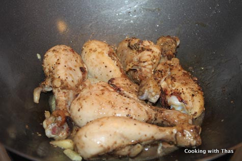 - Combine the chicken legs with the above mentioned ingredients “for marinating chicken”, keep aside for 15 minutes.
