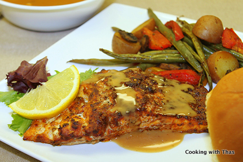 This is an easy recipe, all you have to do is season the salmon with simple spices: you could use any kind of seasonings of your choice. Same with the veggies: have any veggies of your choice and sprinkle spices over it and toss them in a baking tray. Let them bake in the oven till nicely done. A healthy delicious dinner will be ready in no time. You could also serve dinner rolls or bread.
