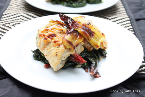 - On a clean plate, place some sauteed swiss chard, place 2 stuffed chicken breasts, pour any juice from baking the chicken left on the baking sheet and top it with 3 slices of Ghee roasted plantain.