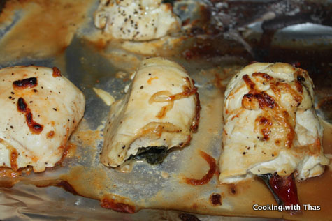 - If there is any cheese popping out of the roll, remove it and spread it over the chicken.
