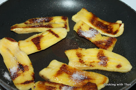 - Melt the ghee in the heated pan, place the plantain slices over it.