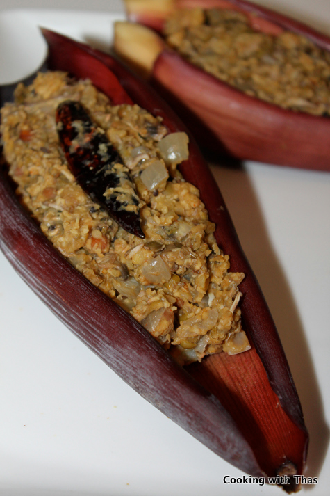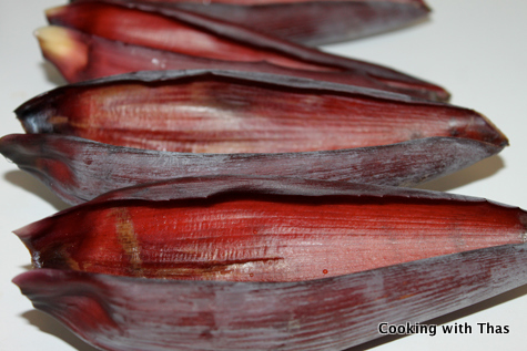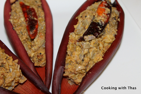Whenever my mom finds a banana flower, she used to make this stir fry and I loved this. When I saw this flower in the grocery store, I was reminded of the delicious stir fry my mom made and my mouth watered instantly. When I bought this, the only thing that I was aware was that the cleaning was a tedious and time consuming process. I recalled how my mom used to clean this staining her hands, that time I only cared about the tasty dish I would get to gobble, not helping her in anyway. I was a big time slacker then 🙂