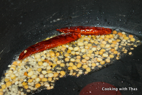 • Heat oil in a non-stick pan, add mustard seeds and let it splutter, add dry red chili.