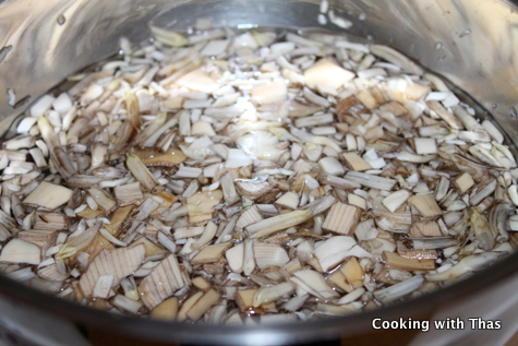 7. Drain the water from the chopped flowers and add to the onions and saute.