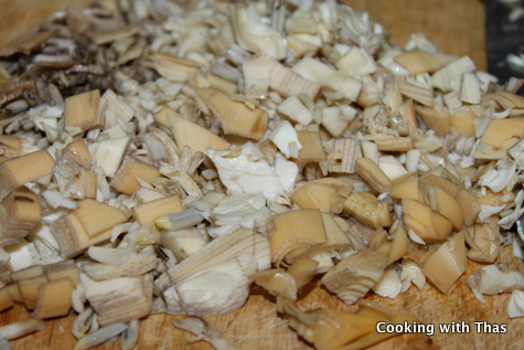 • Once you separate the stamen from the florets and the inner tender bulb from the flower, chop these coarsely with a sharp knife and put them into a bowl of water drizzled with lemon juice, this is to prevent the oxidation of the flowers and to prevent them from turning black in color.