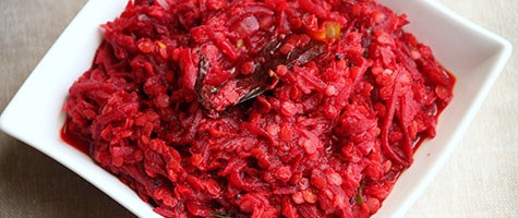 I usually make Kerala style thoran or stir fry with beetroot and coconut. The other day, I made something different by adding red lentils and yogurt to the beetroot. I loved the addition of red lentils in this dish and I let the lentils remain slightly crispy rather than making it mushy. The bite of slightly crispy lentils was amazing and the yogurt gave it a slightly tart taste. This vibrant dish not only makes a perfect side dish but a healthy one too it’s packed with nutrients and vitamins.