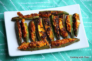 - Transfer the stuffed okra to a plate lined with paper towel to absorb excess oil.