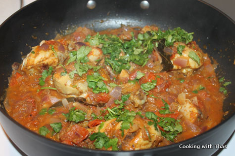 - When the chicken is half cooked, add the onions and tomatoes, cook covered till the tomatoes have mashed up and onions have cooked well.