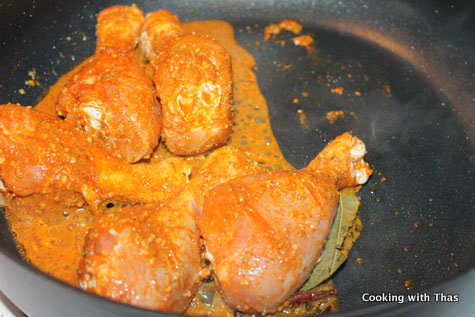 - Add the marinated chicken and cook covered till the chicken is half cooked. If the chicken gets dry, add some water and cook.