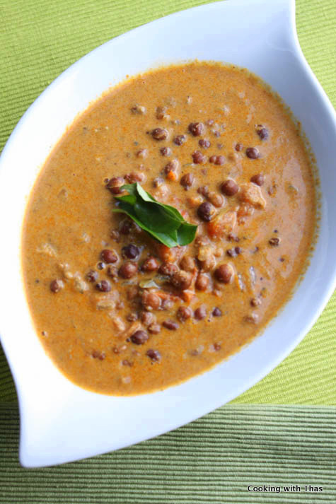 When I hosted the Eid contest, one of the recipes I got was the Soy chunks cooked in roasted coconut gravy by Greenhorn Cook. I made that recipe and fell in love with it, especially the roasted coconut gravy. Making the gravy was very similar to the gravy that was made by me for making the fish curry. Literally, anything can be added to that gravy, so this time I added black chickpeas. Tasted delicious & I was seen drinking the gravy…Yummy!