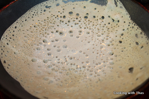 - Cover with a lid and cook for a few minutes. You can see pretty small holes forming on the appam.