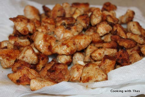 2. Shallow fry the chicken in oil till it turns golden in color, keep aside on a paper towel.