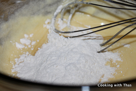 • Add all purpose flour/baking powder mix little by little to the wet mixture and fold it using a whisk.
