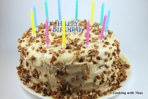 I love butterscotch flavor, that’s the main reason why I picked this recipe. Loved the cake, butterscotch sauce and the frosting. While making the frosting and sauce you would feel that it’s going to be too sweet, believe me it wasn’t that sweet as it looks like. In fact the cream cheese in the frosting compensated the sweetness of the brown sugar. Also, do try with brown sugar only then you’ll get the butterscotch flavor. Pecans sprinkled over the cake did give a crunchy and nutty flavor to the cake. You could use any nuts if you prefer.