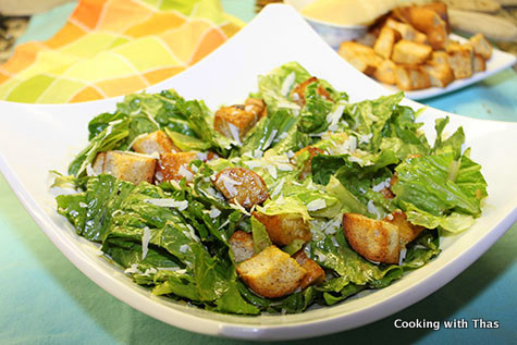 It’s said that the original recipe did not have anchovies added to it, Worcestershire sauce was added which imparted the anchovy flavor. In this recipe, anchovy fillets that are cured and preserved in oil are added. Another ingredient that’s added in Caesar salad is raw egg. Some people substitute mayonnaise for raw eggs. The baked croutons gives an amazing crunch to this salad. Overall, I find this recipe to be a winner.