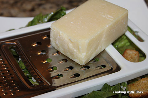 - Add the chopped romaine lettuce, baked croutons and grated parmesan cheese, toss everything well.