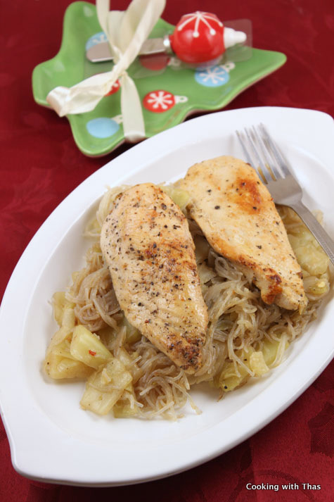 I love to sprinkle cajun seasonings on my dishes, it enhances the flavor of any dish instantly. I used to make baked cajun tilapia a lot and have posted the recipe for it. Last night for dinner, I had some leftover oyster cabbage noodles that I had made the previous day. Lately, I’ve been very interested in making quick fix meals and the oyster cabbage noodles is one such dish. I was so happy to have this again for last night’s dinner, but I didn’t see much excitement on my hubby’s face. To put a smile on my hubby’s face while having dinner, I decided to make cajun chicken and served it over the oyster cabbage noodles. I pan fried the chicken after marinating with cajun seasoning. Chicken tasted very delicious along with the oyster cabbage noodles.