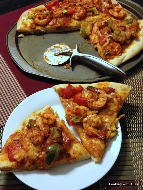It was an impromptu plan to make shrimp pizza last night for dinner. Since, making pizza doesn’t involve too many tedious steps lazy me opted for that. Oh yes, I make my pizza dough from scratch, it just takes a few minutes to make the dough and let stand to rise for an hour. If you like to have pizzas often, then you could make the dough ahead of time and freeze it.