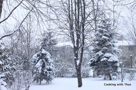 I woke up this morning so late at 12.30, okay that’s really afternoon 🙂 Oh yes! I love to cuddle up as late as possible. Looking out of the window I was excited and refreshed to see the snow showers hitting the ground so heavily and beautifully. Oh yes! snow showers always put a smile on my face and makes me go crazy. Here is a picture of my backyard wrapped up in snow…