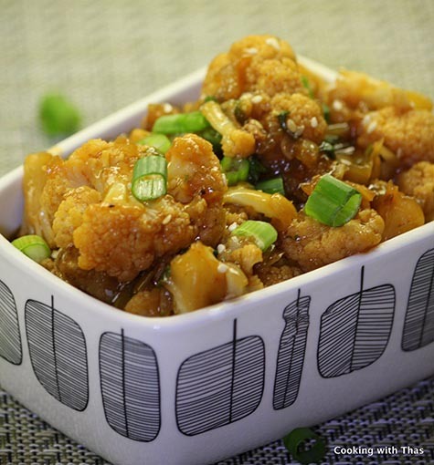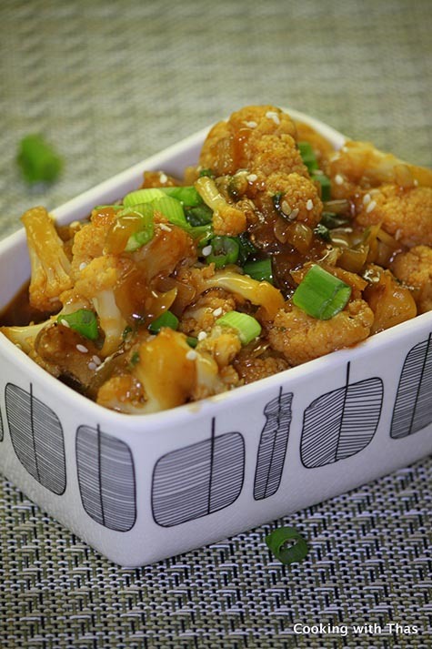 Cauliflower florets stir fried in Chinese sauces like Soy sauce and hoisin sauce…it’s a healthy version without frying cauliflower.