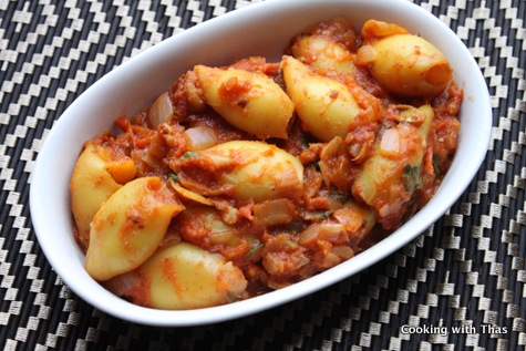 Anything that has a hollow space or if a space can be created within can be stuffed; that’s why we stuff whole chicken, plantian, eggplant, green pepper, peppers, potatoes, whole fish etc etc. Likewise, squid with a void in its tube can be stuffed too. So, this time while making a squid dish, I didn’t let go the opportunity to stuff it. While searching my refrigerator I saw the pretty cauliflower and decided to make a stuffing with it. Cooked the squid, stuffed it with cauliflower and combined it with onion and tomato masala. It was totally worth the effort, a different dish with squid was made and it tasted so delicious.