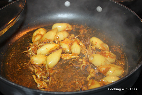• Place the marinated squid in a large pan, add enough water  and cook covered till it’s cooked well and all the water has dried off.