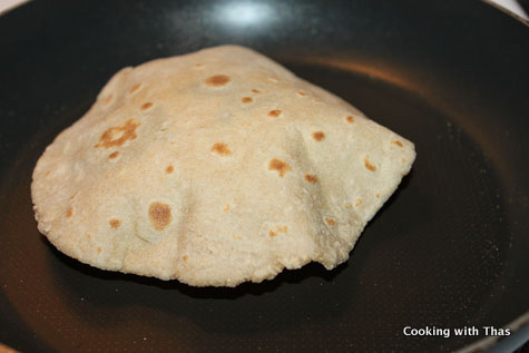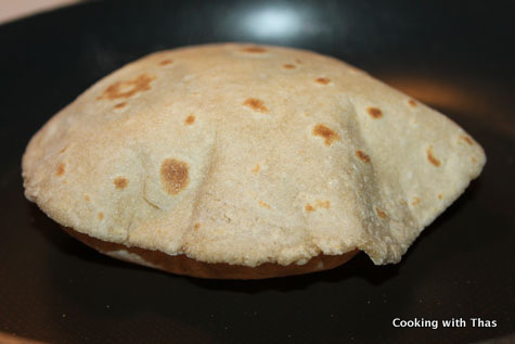 • After you flip the dough over, cook till brown spots appear on the bottom side, again flip it over and gently press on the sides of the dough and it will puff like a balloon.