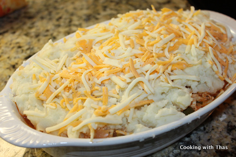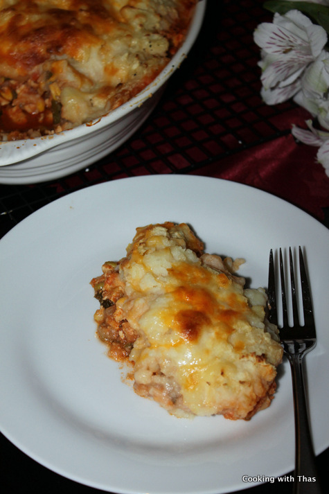 I usually make casseroles with ground beef, this time I used chicken instead. Topped the cooked chicken with mashed potatoes, garnished with cheese and baked it. It was delicious and filling.
