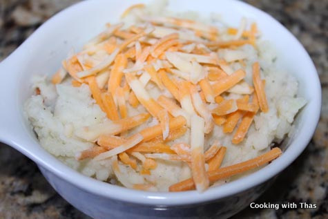 - Add a handful of cheddar cheese on top of the mashed potatoes.