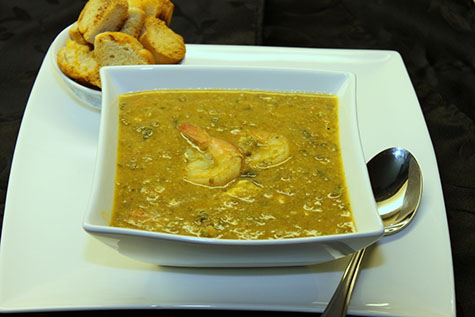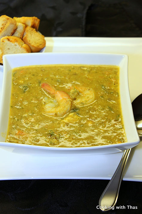 - Combine the soup well and place the pan over medium heat, add cooked shrimp and cilantro, cook for a couple of minutes.