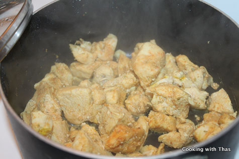 - Add the marinated chicken to a large saucepan, Place over medium heat, close with the lid & cook till the chicken has cooked well.