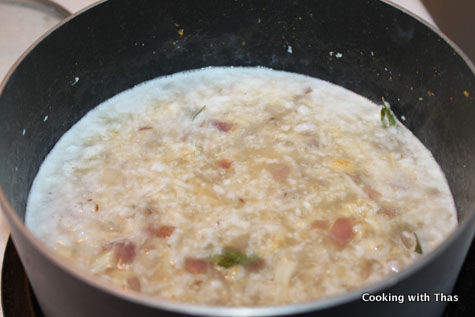 - Lower the heat and slowly add the rice flour, combine it using the back of a wooden spoon.