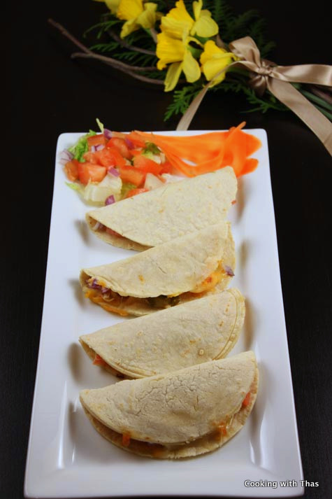 Quesadilla is one of my favorite Mexican dishes. If I see this on the menu of any restaurant, I wouldn’t bother reading the menu till the very end. Quesadilla is basically tortillas topped with chicken, cheese and other ingredients, they are then folded to a half moon shape and are toasted on a pan or griddle till the cheese has melted and glues to the tortilla. In most restaurants, tortillas used for making quesadilla are mostly made with all purpose flour and not corn flour, so gluten intolerant people cannot succumb to this.