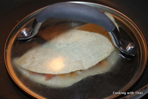 - Uncover the lid and flip it to the other side, when the cheese melts the tortilla would stick together.