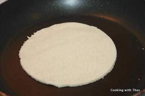 - Place the rolled dough on it, let the bottom side cook for a few seconds.