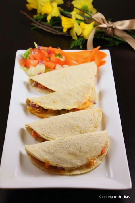 I first made the tortillas from scratch, topped it with cheese, chicken and veggies, folded to a half moon shape and toasted it on a pan. If you don’t want to go through the lengthy process of making the tortilla, you could always use store bought tortillas. Making quesadillas is a breeze if you use store bought tortillas.