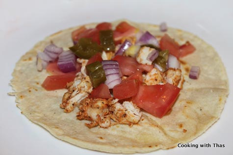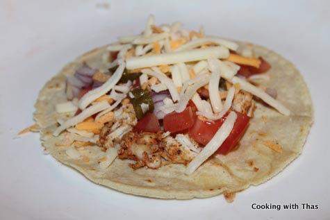 - Top the quesadilla with little chicken, onion, tomato and jalapeno.